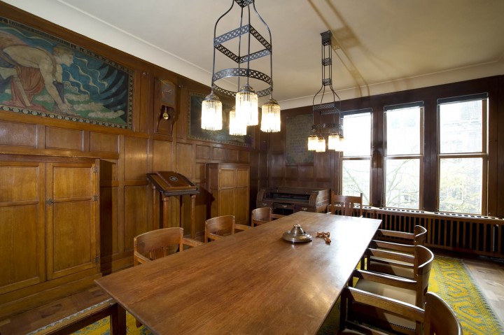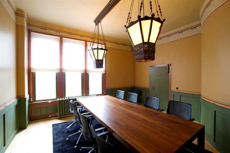 De Burcht heeft drie ruimten voor bijeenkomsten van een kleine (8-10 personen) groep, bijvoorbeeld als vergaderlocatie. Op de rechterfoto de bestuurskamer en op de linkerfoto de kluiskamer. Het interieur van de bestuurskamer is een ontwerp van Berlage. De bestuurskamer is ingericht na invoering van de 8-urige werkdag. De schilderingen verwijzen daarnaar. De kluis in de kluiskamer was voor het veilig opbergen van het archief.